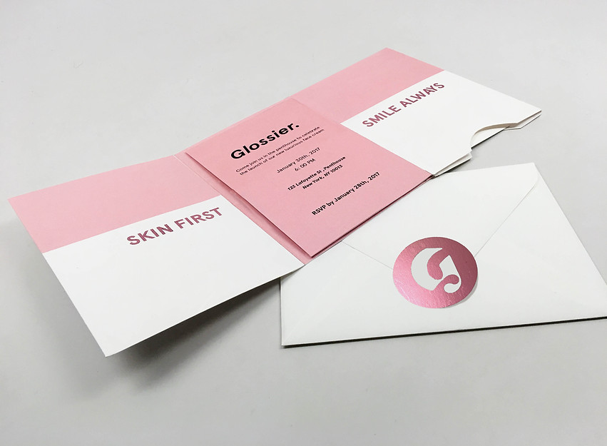 The invitation was designed for Glossier’s launch party of their priming rich moisturizer. For my invitation I decided to follow their minimalist aesthetic and focus on their branding of skin first makeup second. And their brand compared to others can be marked higher due to their strong ethics and mission to promote natural beauty. So the invitation is designed with the minimalist makeup consumer in mind and enticing them with the pacing of information. Which is why I chose to do a three page barrel fold with a pop-up of the product and a pull out RSVP card that emulated their simplistic branding of light pink, white, and black.